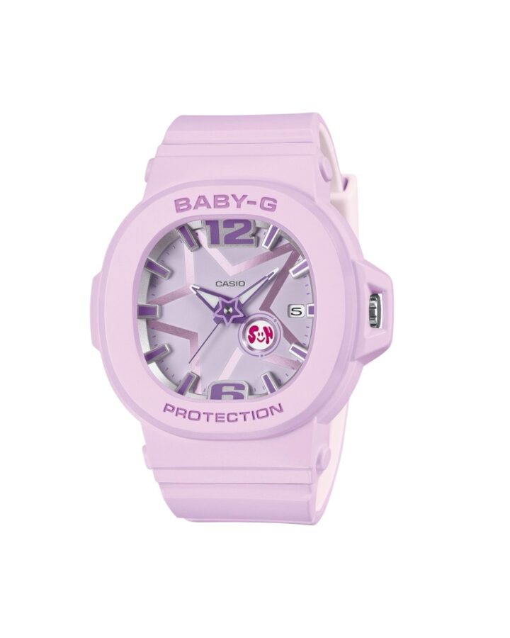 メタリックカラーに、大きなスターがポップな印象。時刻が見やすい3針アナログフェイスに、日付&7タイプの異なるデザインの曜日表示付きで機能性も◎。¥10,450/ベイビージー(カシオ計算機 お客様相談室)