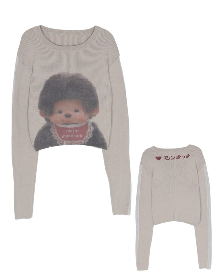 おしゃぶりポーズとそばかすが可愛らしい『モンチッチ』とのコラボニットが登場。大胆プリントに、バックの「モンチッチ♡」ロゴがキュート。サイドラインのレースも見逃せない! ¥7,920/ジュエティ ©2025 Sekiguchi Co.,Ltd.