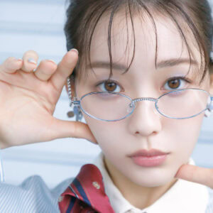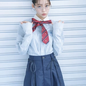 シャツ¥14,300/マルディメクルディ(マルディメクルディジャパン)、スカート¥6,050/イデム、メガネ¥4,950/カーメロ(ともにアンティローザ)、イヤリング¥2,310/ゴールディ、ネクタイ¥1,100、レッグカバー¥880/ともにスピンズ