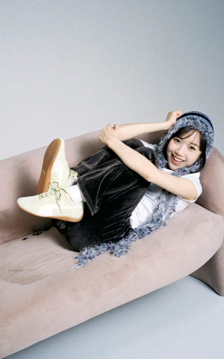 Tシャツ¥27,500/ディーゼル(ディーゼル ジャパン)、ベロアパンツ¥35,200/ア ベイシング エイプ®(BAPE STORE® 原宿)、ニット帽¥5,500/ラフネック(ハナ コリア)、スニーカー¥15,400/プーマ(プーマ お客様サービス)