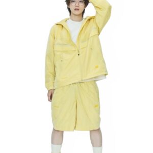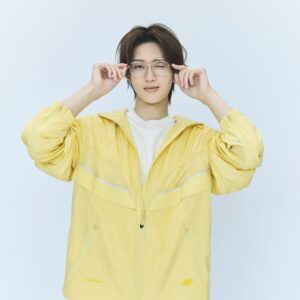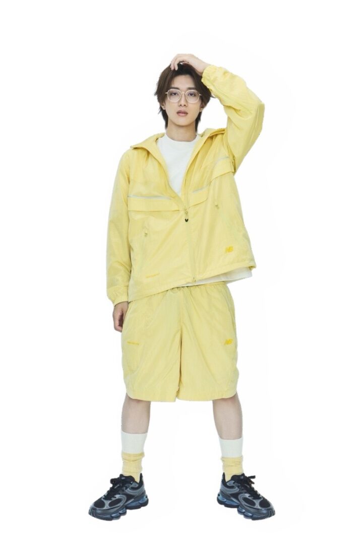 ジャケット¥24,200、中に着たTシャツ ¥6,930、ハーフパンツ¥11,990、スニーカー¥24,200/以上すべてニューバランス(ニューバランスジャパンお客様相談室)、メガネ¥15,000/オンデーズ、ソックス¥1,980/ホイサム