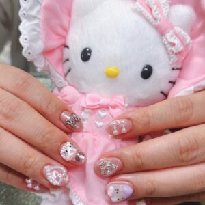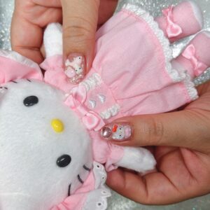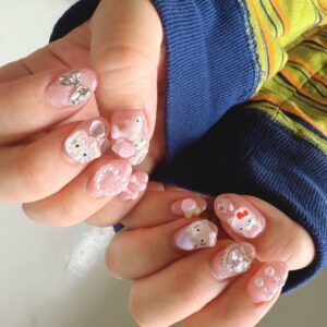 爪先がみずみずしく見えるような細かいラメのペールトーンピンクをベースに、キティさん、リボン、ハート、バラパーツを好き放題乗せて。とくに左手親指にはイルカに乗ったキティ、リボン、バラをぎゅうぎゅうに。爪が大きめでよかった、と思う瞬間です。たくさん用意のあるパーツの中から、サイズや形など、雰囲気にあるリボンやハートを探してくれました。※ホワイトフリルシリーズをテーマにしてるのに、ぬいのサイズ的に別キティさんで撮影してすみません。