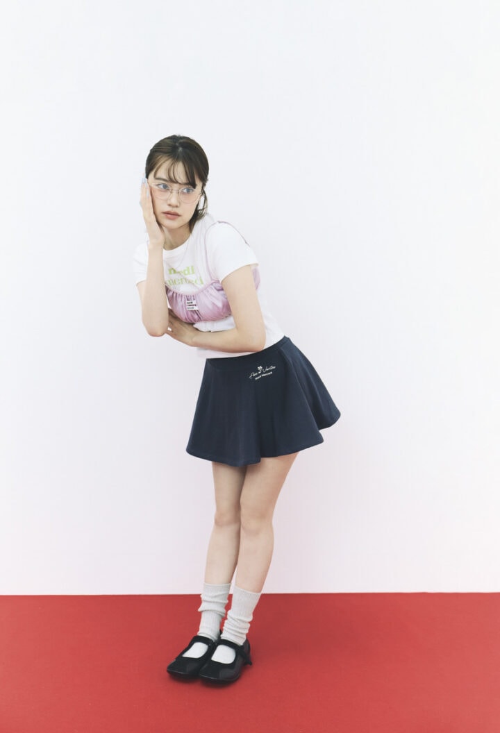 Tシャツ¥6,050、ビスチェ ¥9,900、スカート¥9,900、ソックス¥2,750/以上すべてマルディメクルディ(マルディメクルディジャパン)、メガネ¥9,900/RIM(JINSカスタマーサポートセンター)、ネックレス¥7,040/ミミサンジュウサン(サンポークリエイト)、シューズ¥20,680/ペモント(ハナ コリア)