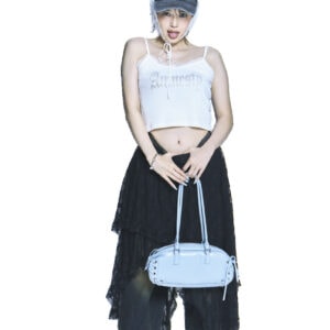 キャミソール¥2,474、レーススカート¥4,399、デニムパンツ¥4,399、キャップ¥1,649、バブーシュカ¥1,099、ブレスレット¥770、バッグ¥3,299/以上すべてウィゴー、サンダル¥11,550/ル タロン(ル タロン 有楽町マルイ店)
