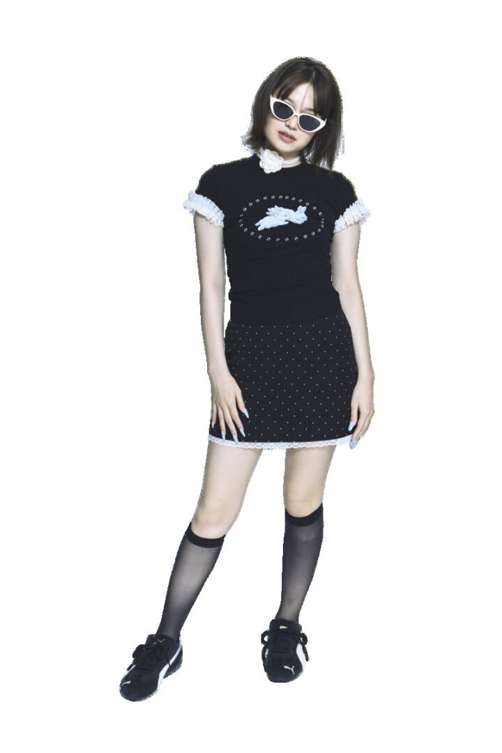 Tシャツ¥3,850、ミニスカート¥3,289、サングラス¥1,760、ローズチョーカー¥1,320/以上すべてスピンズ、スニーカー¥15,400/プーマ(プーマ お客様サービス)、ソックス/スタイリスト私物