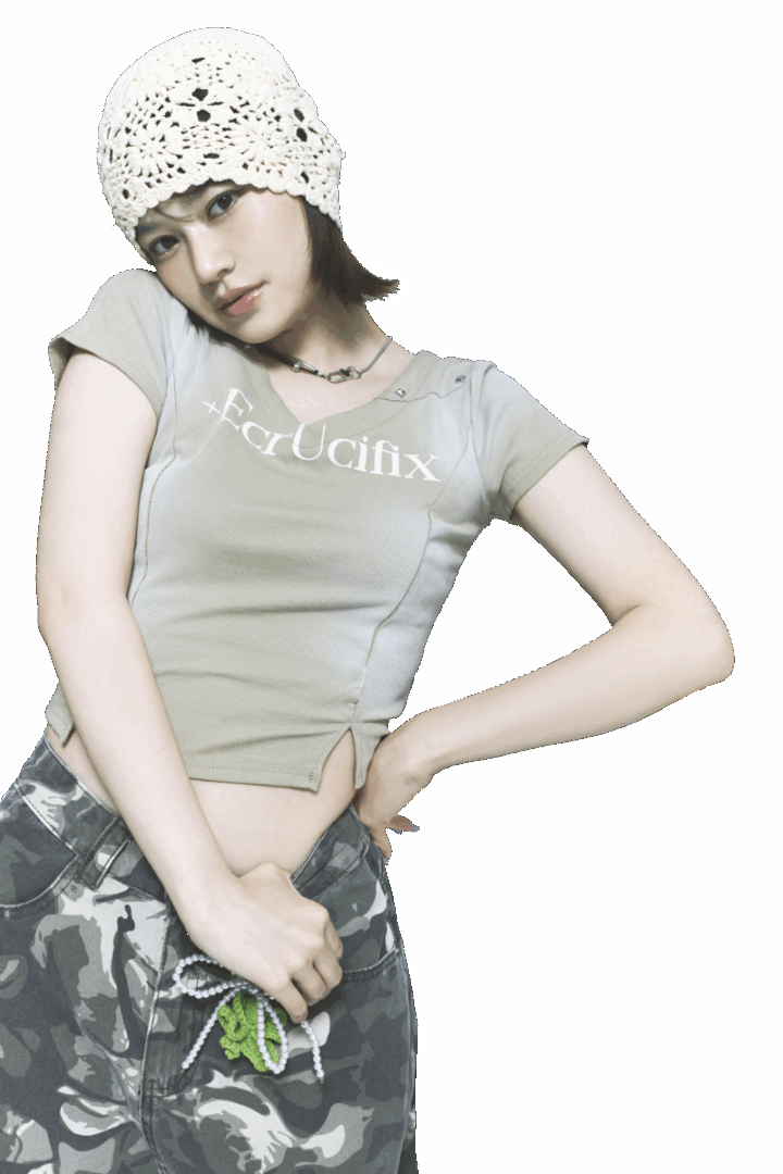 Tシャツ¥3,289、パンツ ¥5,489、ハット¥3,289、ネックレス¥880、パンツにつけたリボンチャーム¥770、パンツにつけたクロシェチャーム¥550/以上すべてスピンズ