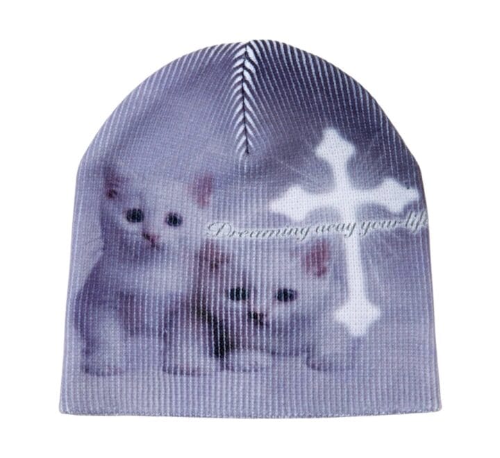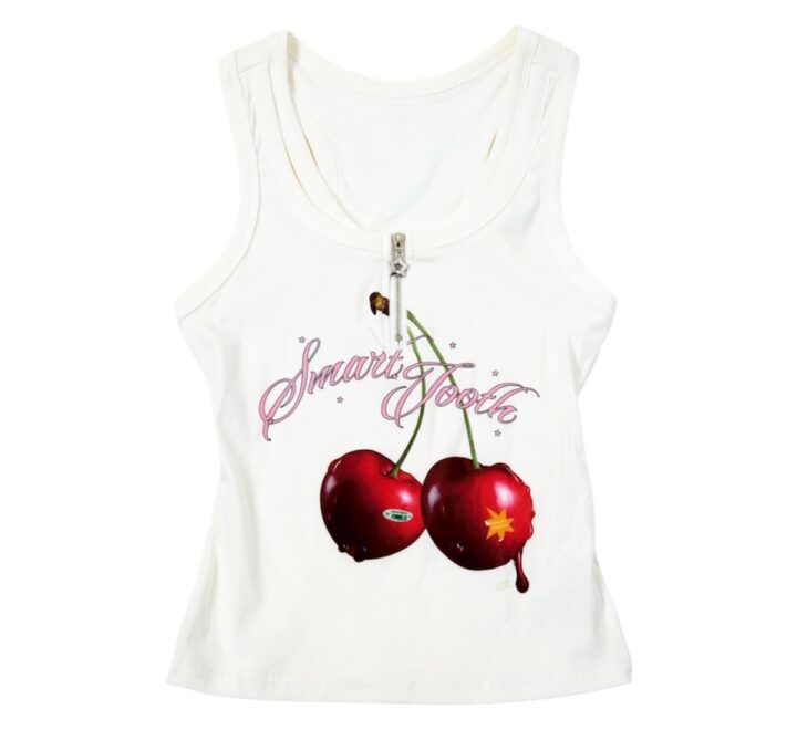 【上から】キャットプリントが可愛い♡ ユニセックスなムードも◎。ニット帽¥2,750、主役級のチェリー柄。タンクトップ¥3,289、トレンドのワイドなシルエットに、ダメージ加工でラフさに拍車。デニムパンツ¥4,389、ハートモチーフがガーリー。プラスオンするだけで洒落感アップ。ベルト¥1,320/以上すべてスピンズ