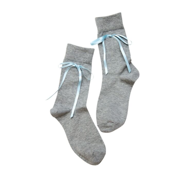 【上から】赤×青のポップな配色にロゴ入りで鮮度抜群! ソックス¥990、ミニスカートに合わせてはきたいシアー素材。ソックス¥1,210、ガーリー度爆上がりのリボン付き♡ ミュールサンダルに合わせて、とことん乙女な着こなしを。ソックス¥1,540/以上すべて靴下屋(タビオ)