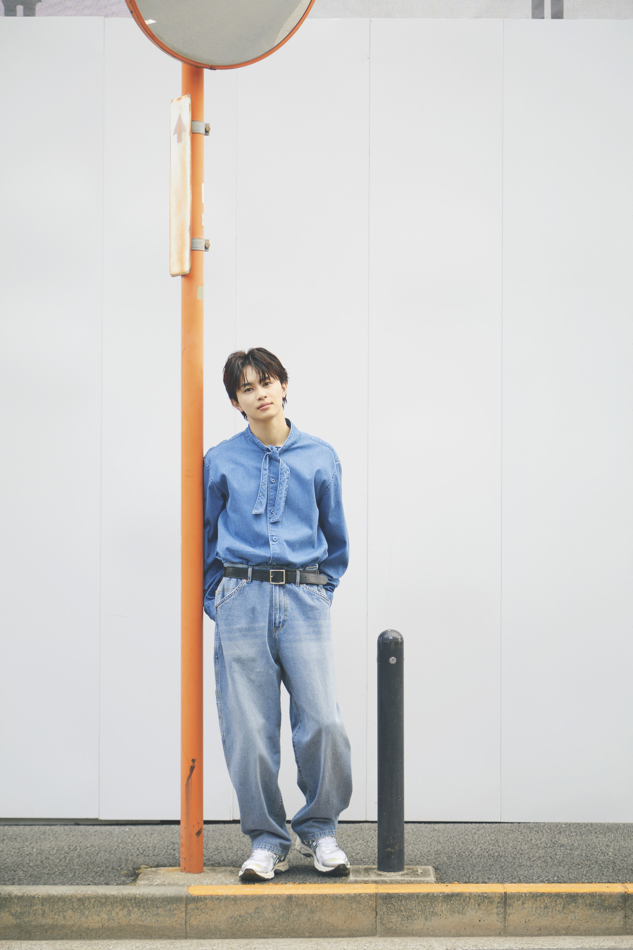 デニムシャツ¥39,600/ブルーナボイン(ブルーナボイン代官山店)、デニムパンツ¥9,790/JEモーガン(ライオンキングジャパン)、スニーカー¥22,000/アシックス(アシックスジャパン カスタマーサポート部)、ベルト/スタイリスト私物