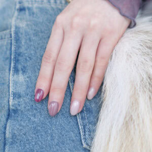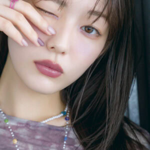 推しの色気に呼応するように、パープルをチラリと下目頭に効かせたメイクでカジュアルな色っぽさを。パープルのニュアンスを秘めたベリーリップをコーデして、やり過ぎない紫担に!