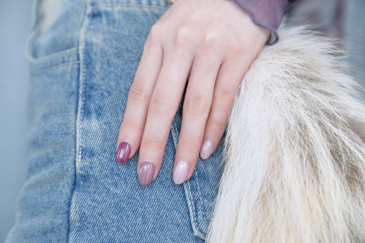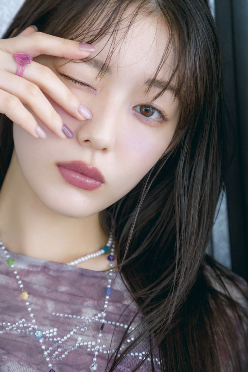 推しの色気に呼応するように、パープルをチラリと下目頭に効かせたメイクでカジュアルな色っぽさを。パープルのニュアンスを秘めたベリーリップをコーデして、やり過ぎない紫担に!