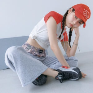 Tシャツ¥5,280、スニーカー¥21,230/ともにナイキ スポーツウェア(ナイキ カスタマーサービス)、パンツ¥6,990/ナディア フローレス エン エル コラソン、キャップ¥7,200/ミーンデリ、ブレスレット¥10,230/ミュゼアール(ともにハナ コリア)、チョーカー¥2,090/ゴールディ、リング¥2,530/アネモネ(サンポークリエイト)