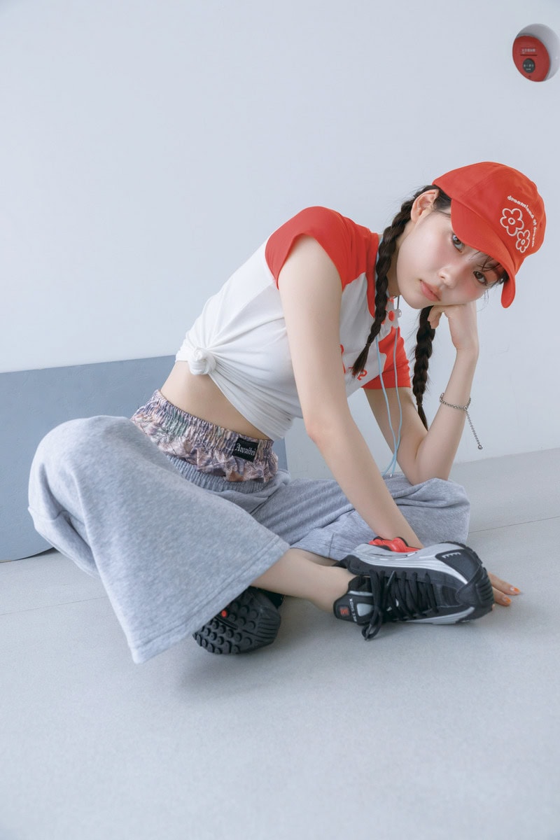 Tシャツ¥5,280、スニーカー¥21,230/ともにナイキ スポーツウェア(ナイキ カスタマーサービス)、パンツ¥6,990/ナディア フローレス エン エル コラソン、キャップ¥7,200/ミーンデリ、ブレスレット¥10,230/ミュゼアール(ともにハナ コリア)、チョーカー¥2,090/ゴールディ、リング¥2,530/アネモネ(サンポークリエイト)