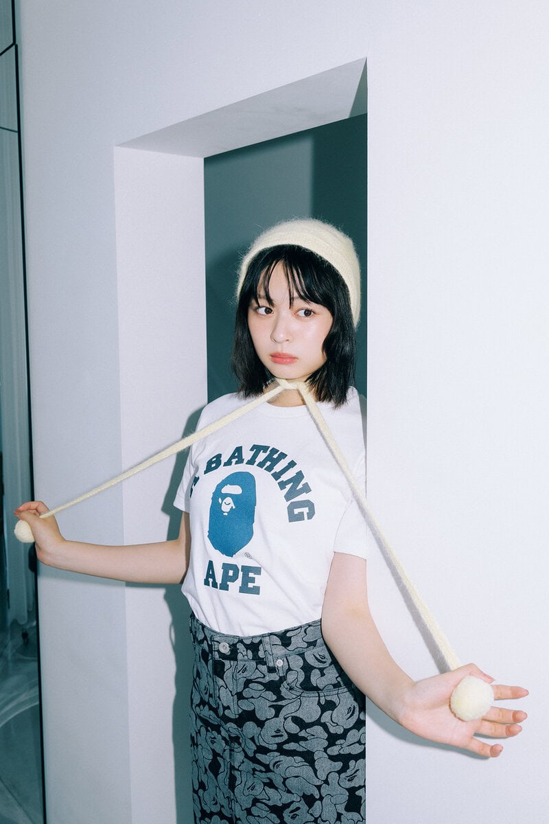 Tシャツ¥9,900、スカート¥2,970/ともにA BATHING APE®︎(BAPE STORE®︎ 原宿)、ニットボンネット¥26,400/ブランク(H3O ファッションビュロー)、リング¥18,700/エテ
