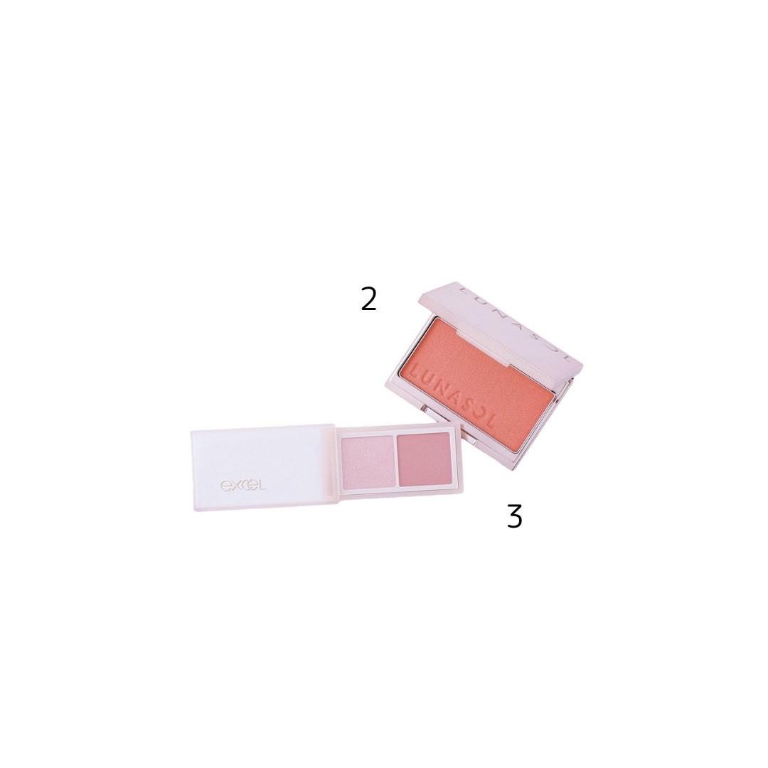 2.赤みを感じるソフトなピンクチーク。ルナソル カラーリングシアーチークス(グロウ)07 ¥3,850(セット価格)/カネボウ化粧品 3.ピンクトーンの濃淡、パール&マット質感で、ニュアンスEYEに。エクセル アイニュアンサー EN03 ¥1,210/常盤薬品工業