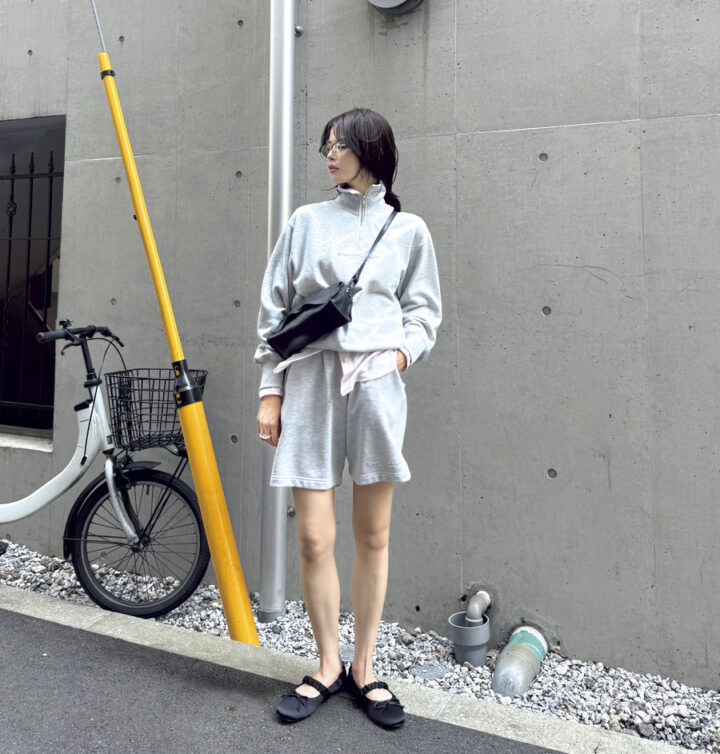 同素材のセットアップのリラックスコーデ。さりげなくレイヤードで重ねているシャツをベイビーピンクにしたのもポイント。足元にバレエシューズを合わせて、カジュアルとバレエコアのMIXスタイリングに。