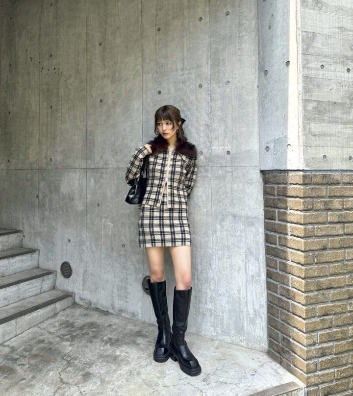 柔らかいブラウンを基調にしたニットセットアップ に、ブラックの小物を合わせ、可愛いチェックが目立つコーディネイトにしまし た。トップスはファー付きでトレンドがぎゅっと詰ま っているところがGOOD。