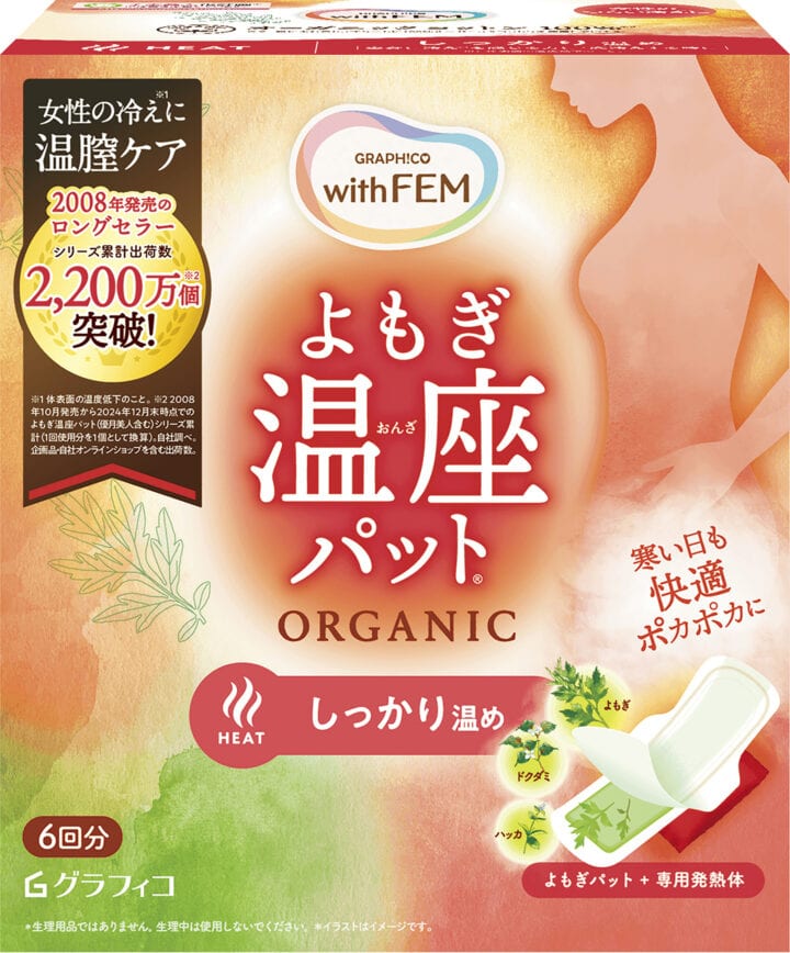 ハーブたっぷりのナプキン型よもぎパットと専用発熱体を下着につけて装着すれば、骨盤まわりがじんわり温まる。ウィズフェム よもぎ温座パット オーガニック 6回分 ¥1,320/グラフィコ