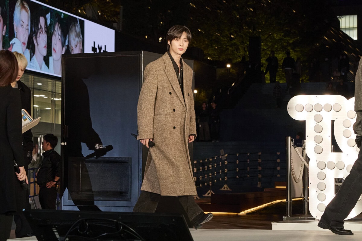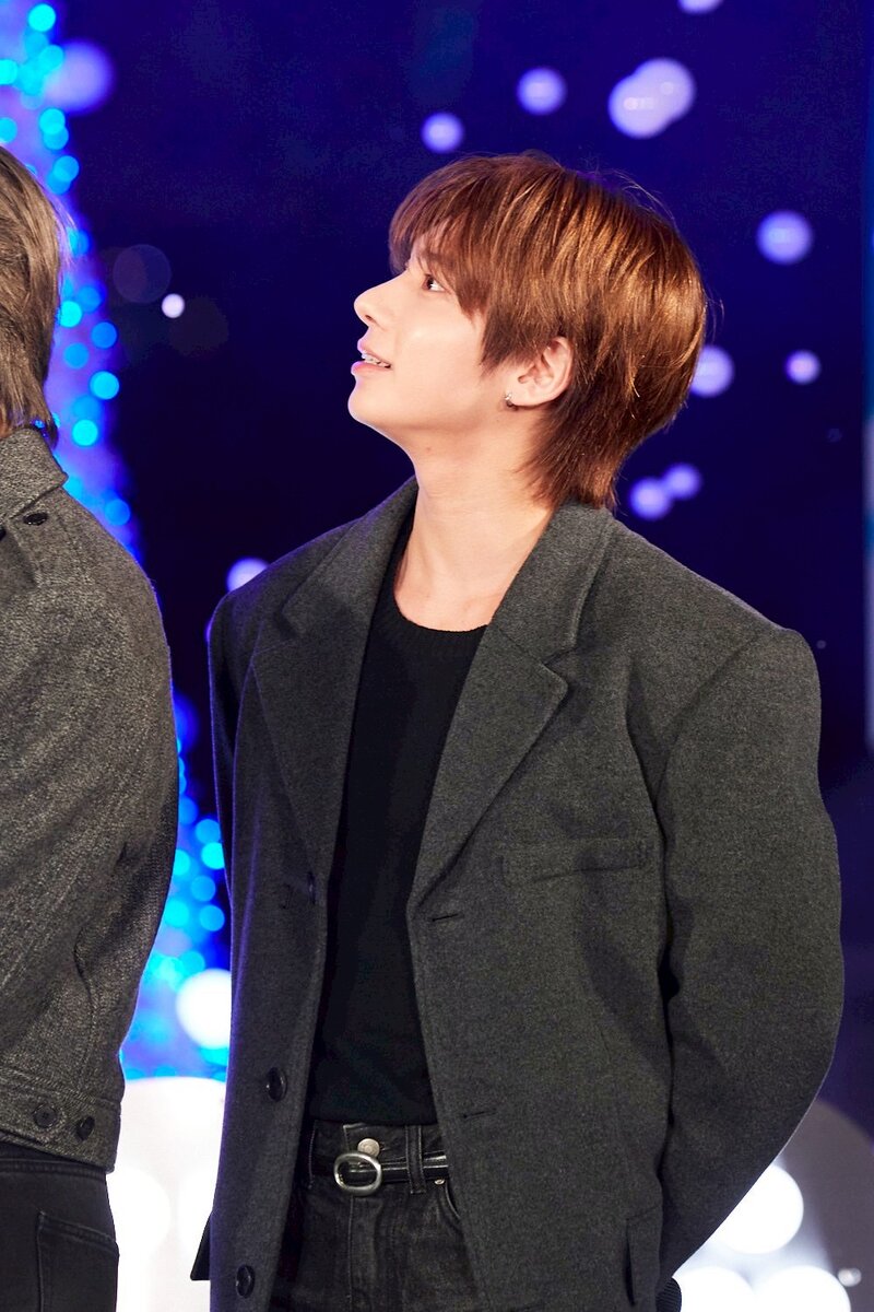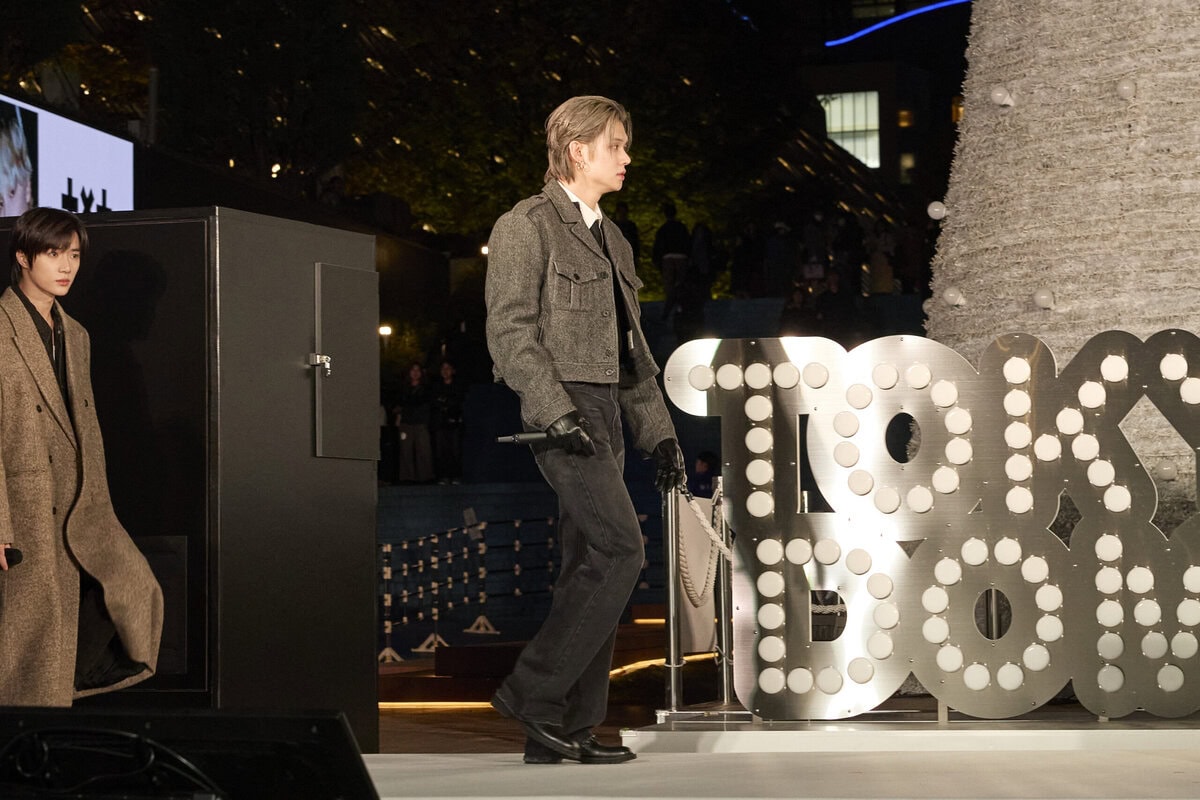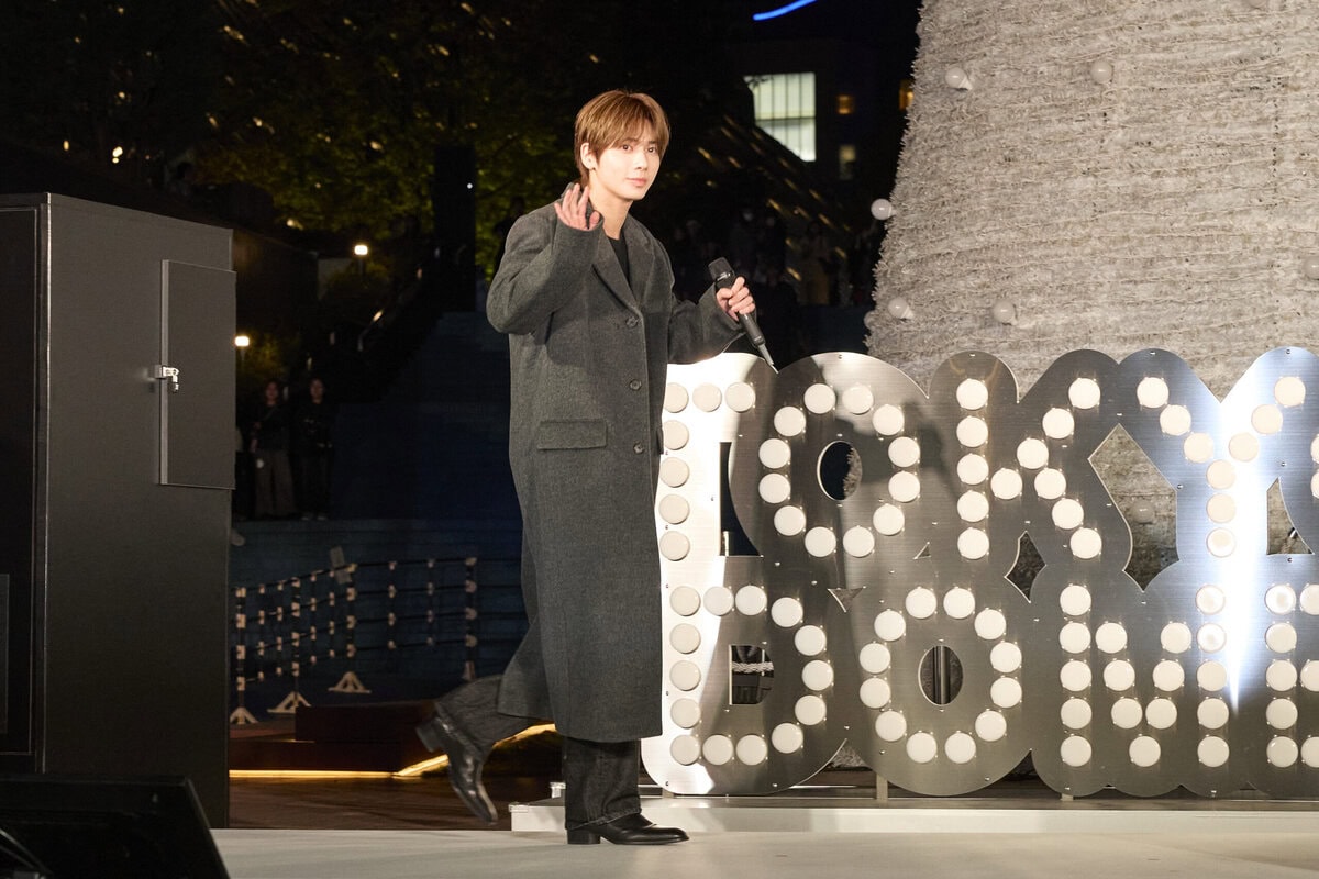 冬らしいキャメルのロングコートやシックなモノトーンスタイルに身を包み、一緒にイルミネーションを見に行きたくなるような王子様な装いで登場したメンバー5人。ツリーの点灯はまだのはずなのに、もうまぶしくて後光がさして見えました。MCからの質問に答えたあと、5人揃ってボタンに手を添えて無事ツリー点灯!(その様子は動画でも♡)