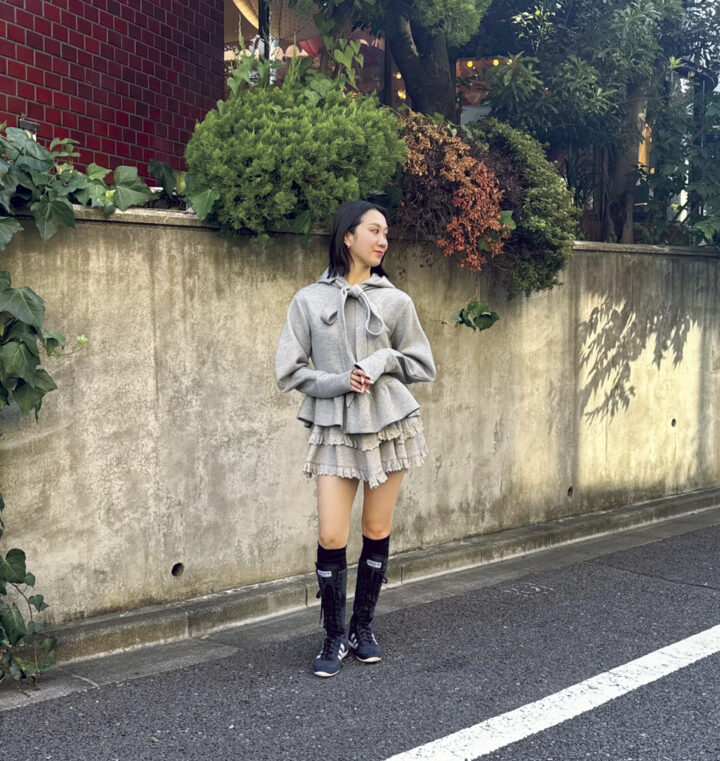 逆三角形のシルエットを作ってすっきりと見えるようにコーデ。大きめのフーディとレース付きのスカートは、セットアップで着るのが可愛くて好きです。特にフーディは袖にボリュームの あるデザインが◎。