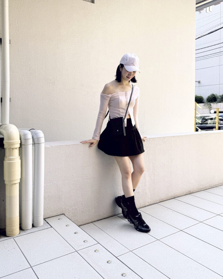 ニットトップスは一方がオフショルになっているアシンメトリーなデザインがユニークでお気に入りです。全体的に甘めのコーディネイトなので、キャップとスニーカーを合わせてカジュアルにまとめてみました。