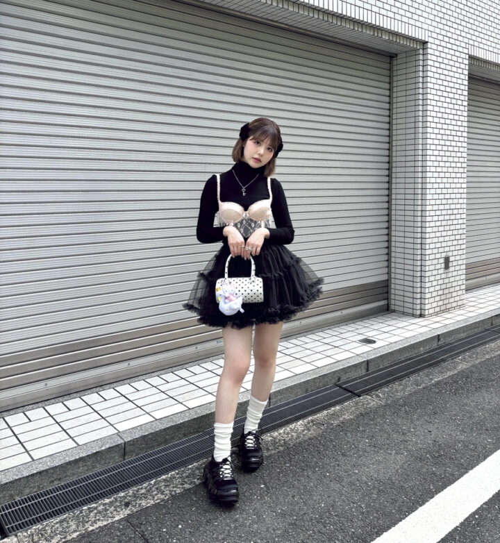 タートルネックニットに古着のランジェリーを合わせたレディライクな雰囲気のコーデに、トレンドのドット柄のバッグを合わせました。全体を黒で統一することで、ポイントになるアイテムが際立つよう意識。