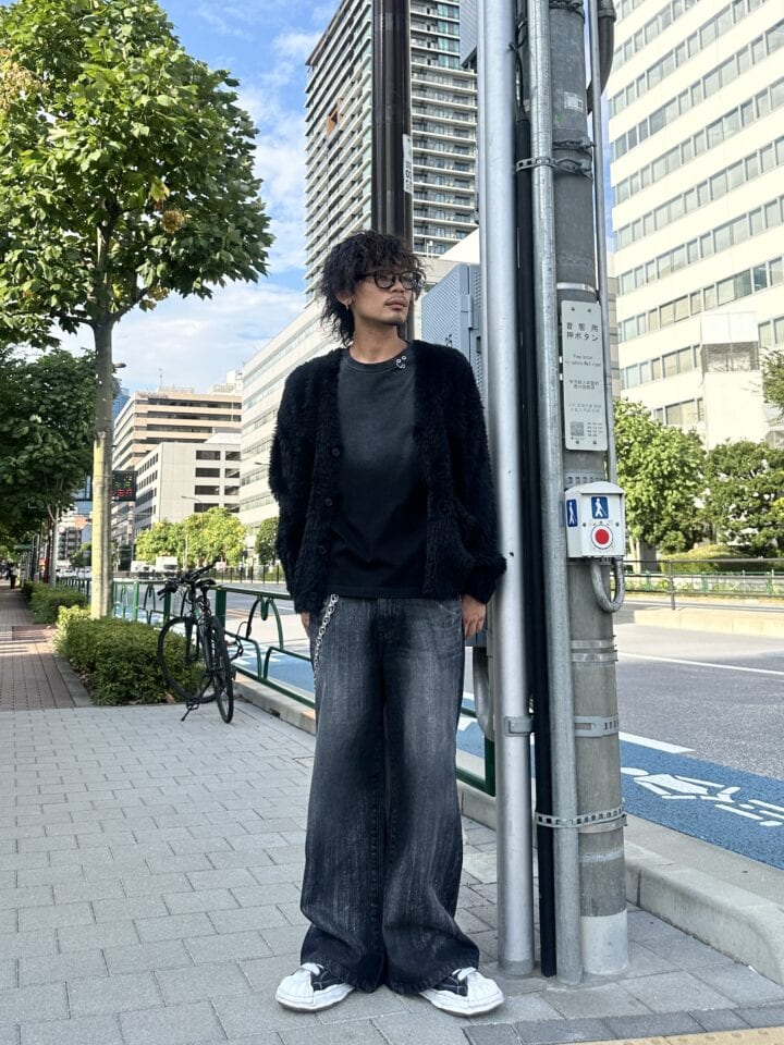 毛足のあるフェザーニットカーディガンにピアス付きカットソーをレイヤードして、シンプルながらも立体感を演出。全体をモノトーンでまとめつつ、 異素材のコントラストで奥行きを出した、都会的なコーディネイトに。