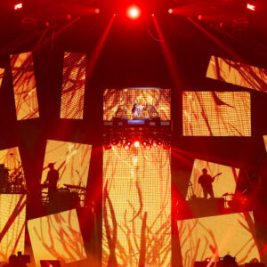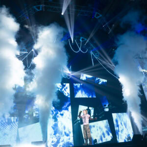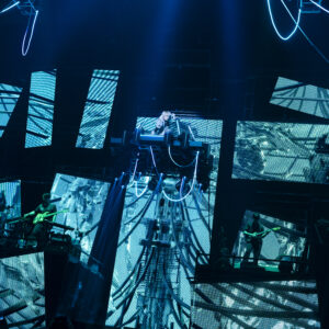 本ツアーのタイトル『Uncanny Valley』は、“ロボットやCGなど人間に似た人工物が、ある程度リアルになった段階で、かえって不気味さや嫌悪感を抱かせる心理現象(不気味の谷現象)”から来ていているという。オープニングから“なんだかすごいことがはじまるぞ!!”というワクワク感と、破格のカリスマ性を誇示したKEYくん。映像が投影されていたメインステージを覆う紗幕が落ちると、いくつものモニターが設置されたステージセットが露わとなり、その中央の天井付近にいるKEYくんのシルエットが目に飛び込んできた。宇宙船のようなセットの中に、超合金ロボットを模したようなシルバーがメインの衣装をまとっている!! 可愛い! 目の前の何かをにらみつけるような表情を見せながら、『HUNTER』の収録曲『Strange』からスタート。生バンドの迫力ある音楽にのって宇宙船が徐々に降下、ステージに着地すると、ダンサーを従えて踊り狂うKEYくんがそこに!