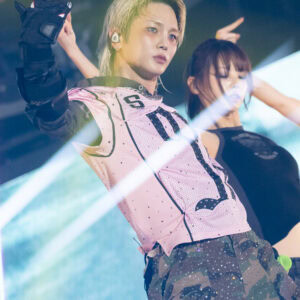 パーカにピンクのユニフォーム風のシャツと、スパンコールを散りばめたアーミー柄のパンツというカジュアルな衣装に着替えると、ライブは後半戦に突入。ヘアスタイルもセンターパーツからかき上げ風にチェンジ! KEYくんの代表曲でもある『BAD LOVE』から『Gasoline』という流れでは、青い炎と赤い炎のような対極の熱さを放って観客を圧倒。『BAD LOVE』では床にひざまづいて許しを請うような姿を見せたかと思えば、『Gasoline』ではせり上がるセンターステージに立ち、炎の演出の中で周囲を先導していくような力強さを見せる。タイトル通り、ド派手な炎の特攻のなかでも、指先の開いたグローブからは可愛いネイルアートがちらりとのぞきます♡