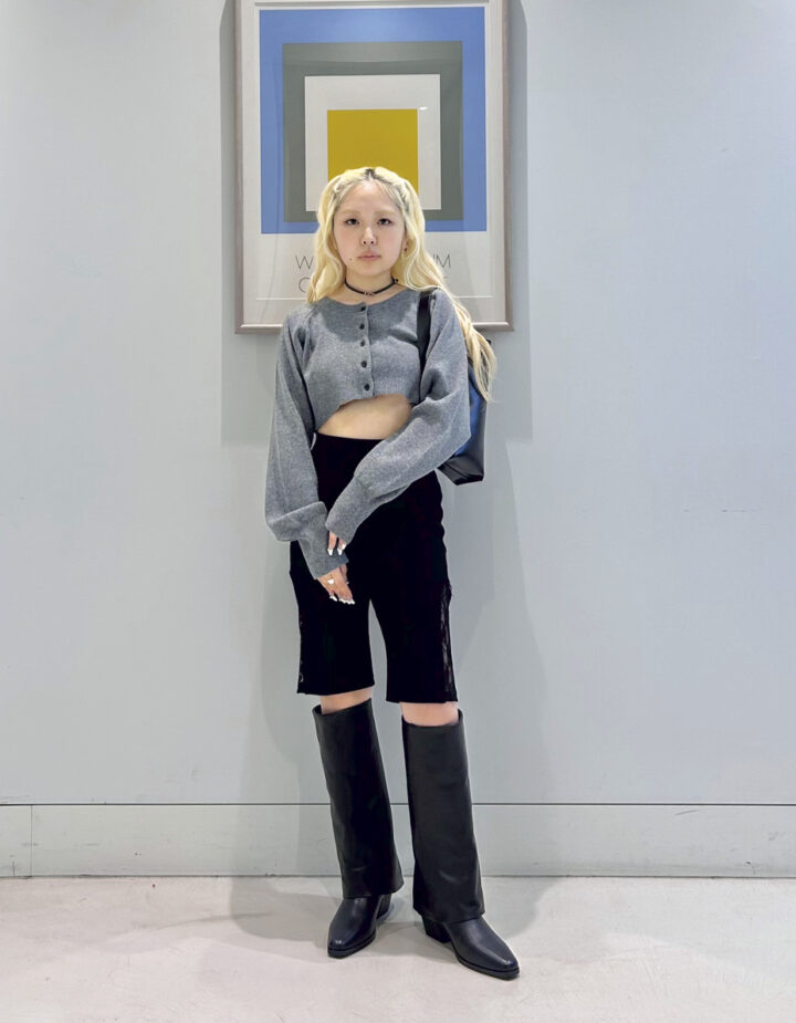 ニットカーディガンは今っぽいシルエットが可愛くてお気に入りです。短丈のシルエットを活かして全体的にコンパクトにまとめてみました。足元はボリュームのあるロングブーツを合わせてスタイルアップ♡