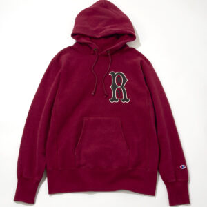 真っ赤なスウェットに白ロゴをどーんと乗せたレトロスウェット。下半身は黒でまとめてシャープな印象に。