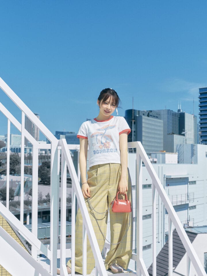 BONRROWTシャツ ¥6,710/ボンロウ(ハナ コリア)、パンツ ¥18,700/ハニーミーハニー、スニーカー ¥15,400/ロックフィッシュウェザーウェア(ブレズ アウト)、シュシュ ¥2,200、ブレスレット ¥3,300、イヤリング ¥1,540/以上すべてアネモネ(サン ポークリエイト)、バッグ ¥13,320/アルキアルカ(ハナ コリア)