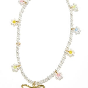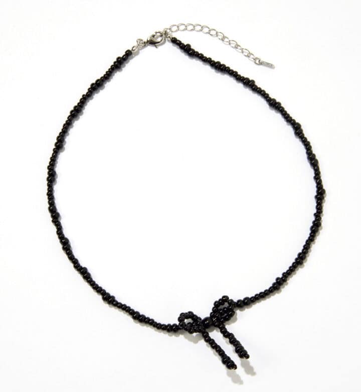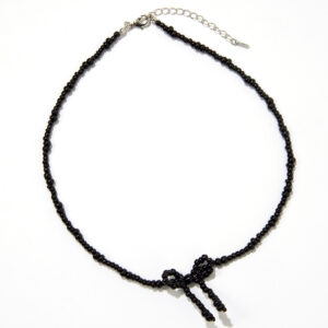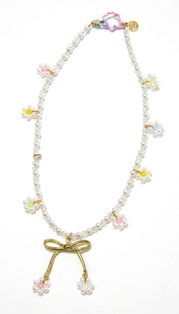 [上から]お花×リボンの主役パールネックレス。¥18,800/スーザン アレクサンドラ(リディア)、好きな長さで巻けるデザインのネックレス。2色のハートモチーフがポイント。¥3,850/マウジー(バロックジャパンリミテッド)、ビーズのネックレスはまだまだブーム。小ぶりな黒リボンがお上品! ¥3,850/スライ(バロックジャパンリミテッド)