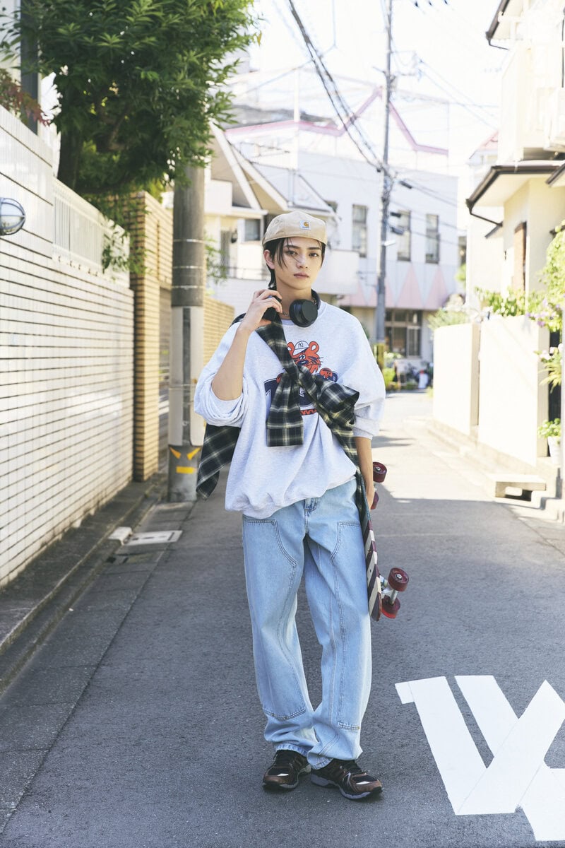 シャツ¥5,940/キャスパージョン(シアン PR)、デニム¥26,400/カーハート WIP(カーハート WIP ストア ハラジュク)、ハンチング¥12,100/カーハート WIP(カーハート WIP ストア ハラジュク)、ネックレス¥5,500/LHME(シアン PR)、スニーカー¥22,000/アシックス(アシックスジャパン カスタマーサポート部)