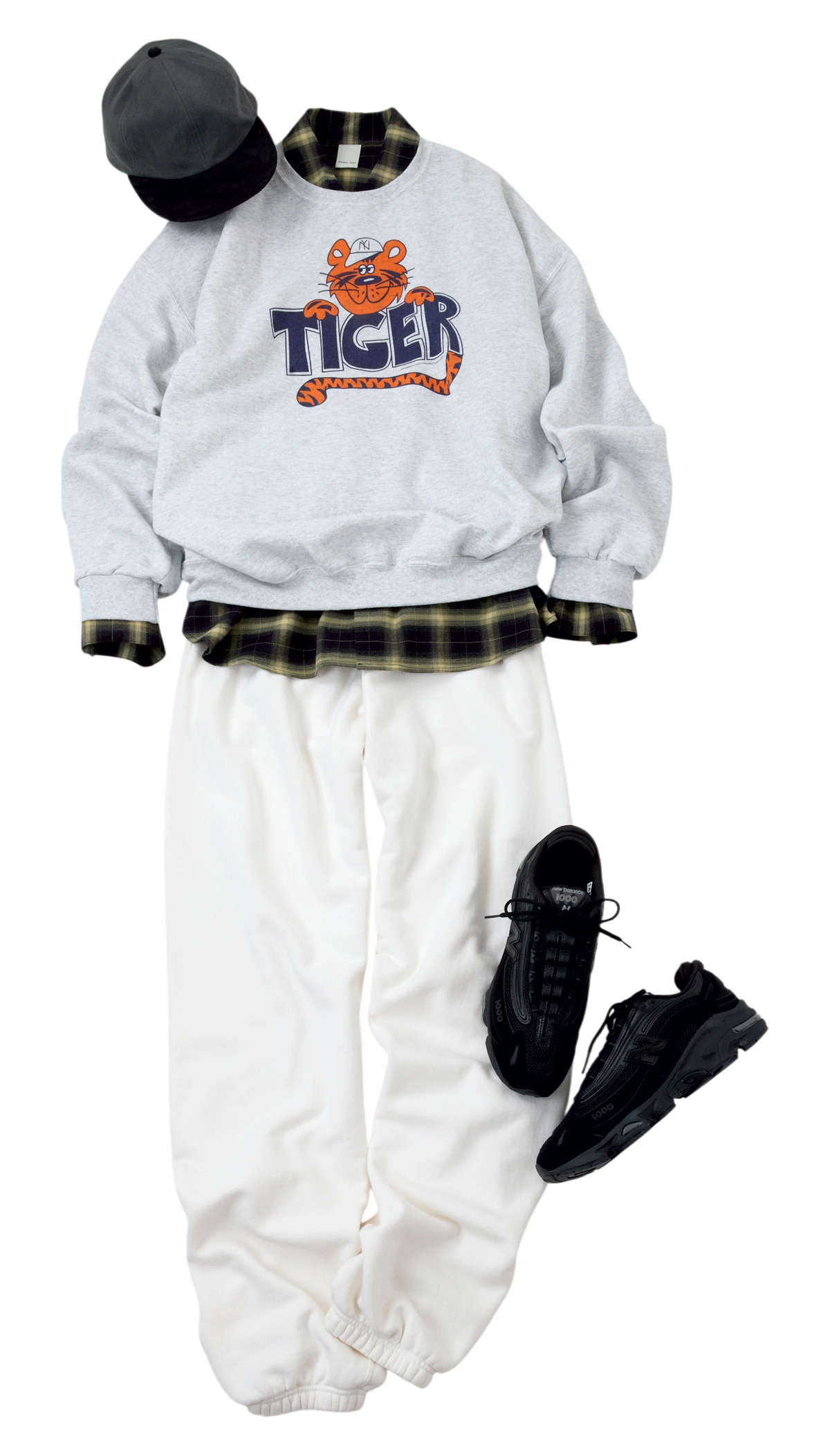 スウェットパンツ¥39,600/へリル(NISHINOYA)、シャツ¥5,940/キャスパージョン(シアン PR)、キャップ¥4,400/ビッグ マイク(ベースメード)、スニーカー¥19,800/ニューバランス(ニューバランスジャパンお客様相談室)