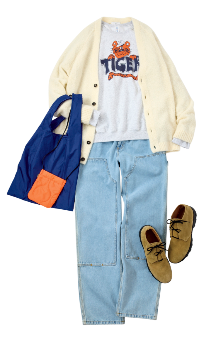 ニットカーデ¥51,700/リヴォラ(スタジオ ファブワーク)、デニム¥26,400/カーハート WIP(カーハート WIP ストア ハラジュク)、バッグ¥2,310/ユナイテッドアスレ(キャブ)、サコッシュ¥3,850/サンディニスタ(トゥー・ステップ)、シューズ¥39,600/AMB(プライム ビアンカ)