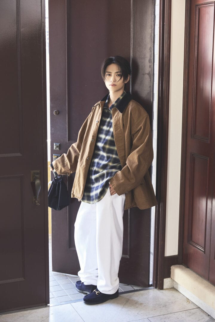 ジャケット¥64,900/グランク(NISHINOYA)、スウェットパンツ¥39,600/へリル(NISHINOYA)、バッグ¥3,300/サンディニスタ(トゥー・ステップ)、ローファー¥19,800/ヒマラヤ(プライム ビアンカ)
