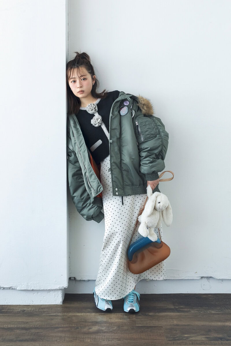 お花付きニットにドットスカートの甘いコーデを、辛口カーキジャケットで中和させれば黄金バランスが誕生。