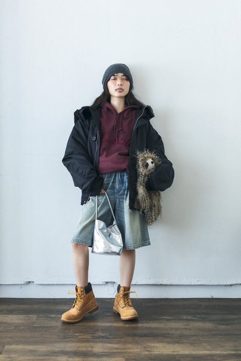ジャケット¥66,000、フーディ¥30,800/ともにカーハート WIP(カーハート WIP ストア ハラジュク)、ハーフパンツ¥36,300/ディーゼル(ディーゼル ジャパン)、ニット帽¥10, 670/カシラ(カシラ プレスルーム)、バッグ¥31,460/ミニットミュート(HANA SHOWR OOM)、ブーツ¥30,800/ティンバーランド(VF ジャパン)