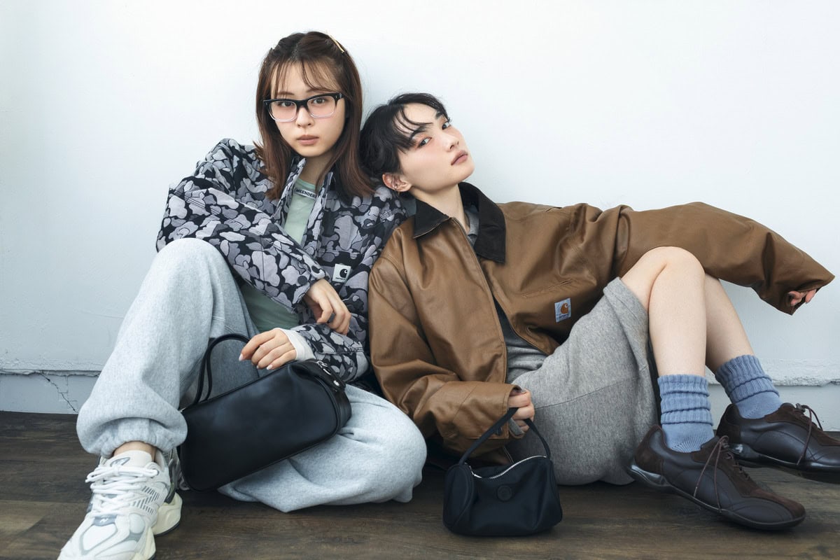 ジャケット¥69,300/カーハート WIP(カーハート WIP ストア ハラジュク)、レイヤードトップス¥10,550/ミーンデリ(ハナ コリア)、スウェットパンツ¥12,980/チャンピオン(ヘインズブランズ ジャパン カスタマーセンター) 、ヘアピン[2SET]¥1,650/アネモネ(サンポークリエイト)、メガネ¥50,380/オリバーピープルズ(ルックスオティカジャパン カスタマーサービス)、バッグ¥40,100/ルメン、スニーカー¥24,200/ニューバランス(ニューバランスジャパンお客様相談室)