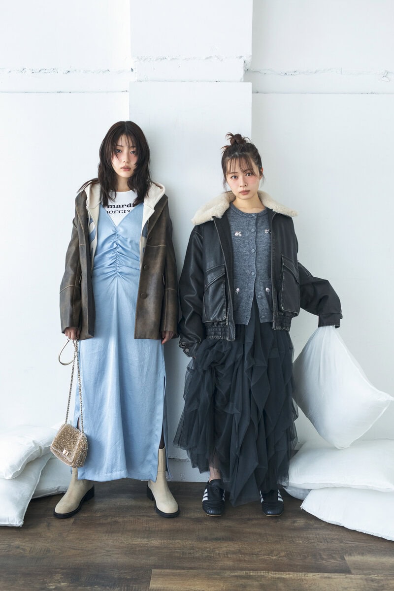レザージャケット¥13,300/エヴリス(エヴリス 新宿ルミネエスト店)、重ねたパーカ¥10,690/イリゴ(HANA SHOWROOM )、キャミワンピ¥35,200/バウム・ウンド・ヘルガーテン(S&T)、下に重ねたタンク¥6,050
