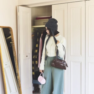 ジップニットカーデ¥12,980/ウアロン(ハナ コリア)、ニット帽¥5,995/スライ(バロックジャパンリミテッド)、茶色のバッグ¥21,560/クリスティーンプロジェクト(ハナ コリア)、ピンクのバッグ¥12,650/ミニットミュート(HANA SHOWROOM)、ブーツ¥59,400/ファビオ ルスコーニ(プライム ビアンカ)