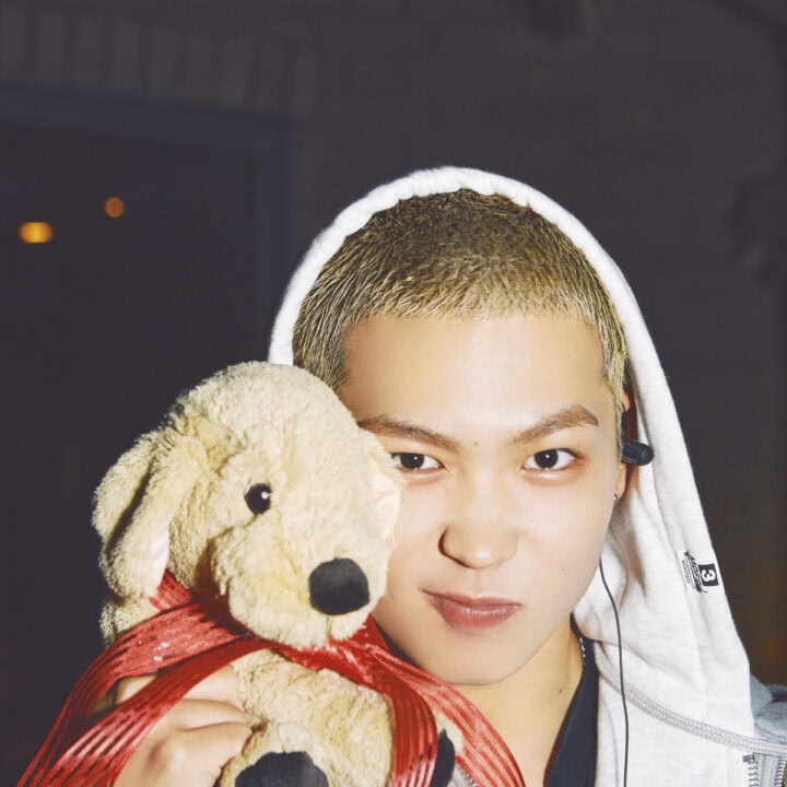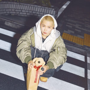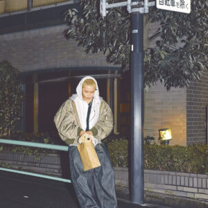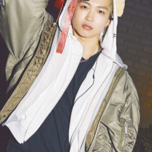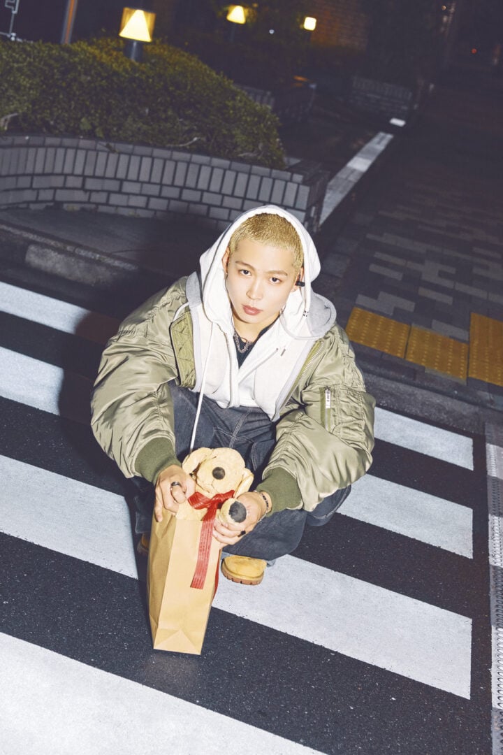 「冬にデートやお散歩するならきれいめなコートやジャケットよりも、ちょっとストリートな格好が一番自然体でいられるかなと思って選びました。Mais on MIHARA YASUHIROのMA-1とパーカがデザインでドッキングされているアウターは、ボリューム感が可愛くてこの冬に購入したお気に入りです。デニムはノンウォッシュの風合いと太めのシルエット、そしてPCが入るくらい大きな後ろポケットがポイント。クリエイターが作業するときにパソコン一つで動くような、ワークパンツっぽいムードがいいなと思って。僕もiPadで作業することが多いので、これならカバンを持たなくても全部入って便利なんです。靴はティンバーランドのイエローブーツ。デニムの刺しゅうのカラーとリンクしていて、このコーディネイトにぴったりだなと思って合わせました」