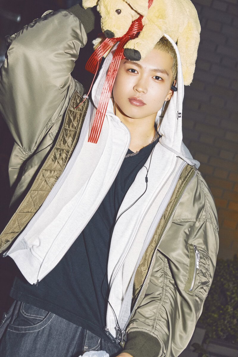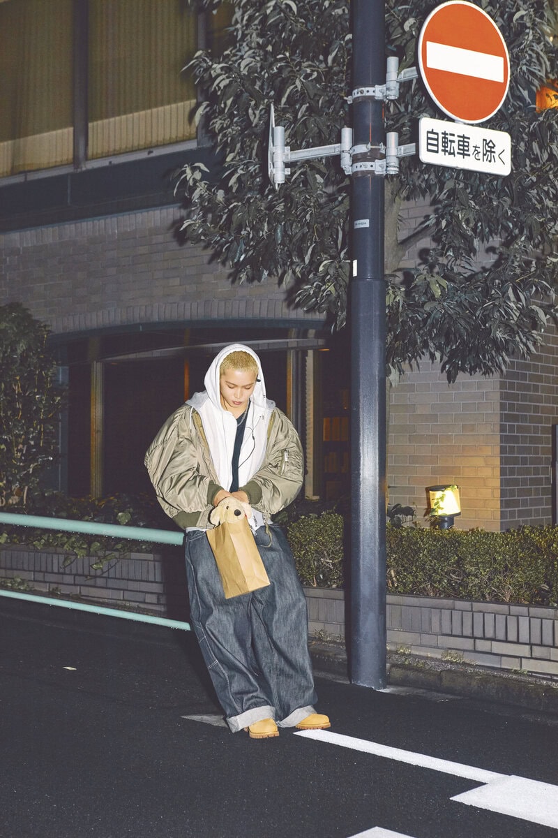 「冬にデートやお散歩するならきれいめなコートやジャケットよりも、ちょっとストリートな格好が一番自然体でいられるかなと思って選びました。Mais on MIHARA YASUHIROのMA-1とパーカがデザインでドッキングされているアウターは、ボリューム感が可愛くてこの冬に購入したお気に入りです。デニムはノンウォッシュの風合いと太めのシルエット、そしてPCが入るくらい大きな後ろポケットがポイント。クリエイターが作業するときにパソコン一つで動くような、ワークパンツっぽいムードがいいなと思って。僕もiPadで作業することが多いので、これならカバンを持たなくても全部入って便利なんです。靴はティンバーランドのイエローブーツ。デニムの刺しゅうのカラーとリンクしていて、このコーディネイトにぴったりだなと思って合わせました」