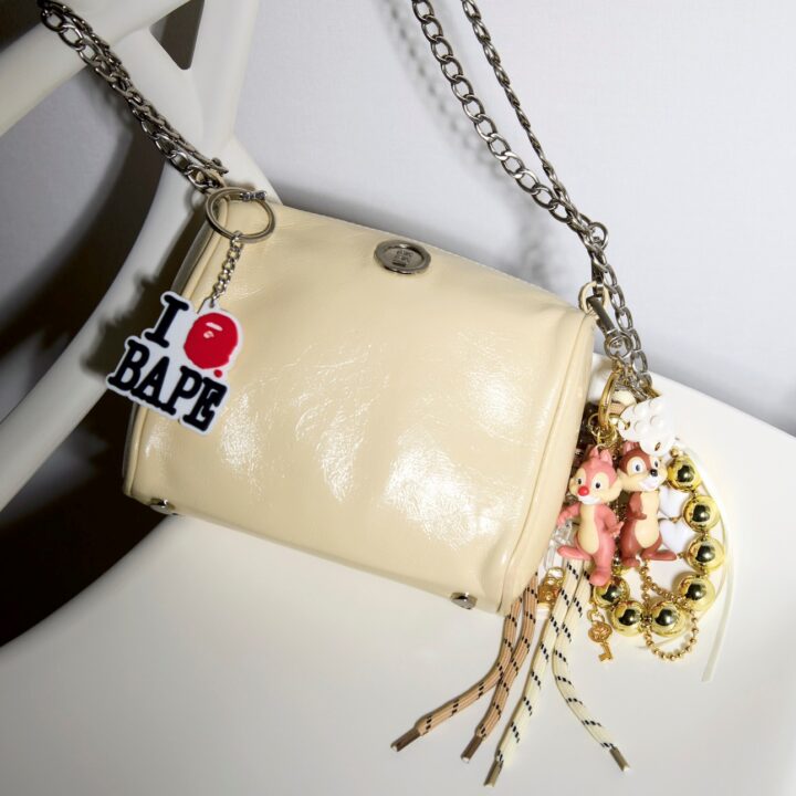 バッグ¥44,330/ミニットミュート(HANA SHOWROOM)、ロゴチャーム¥5,000/ア ベイシ ング エイプ®(BAPE STORE® 原宿)、ゴールドチャーム¥1,980/アネモネ(サンポークリエイト)、キャラチャーム¥3,500/sep