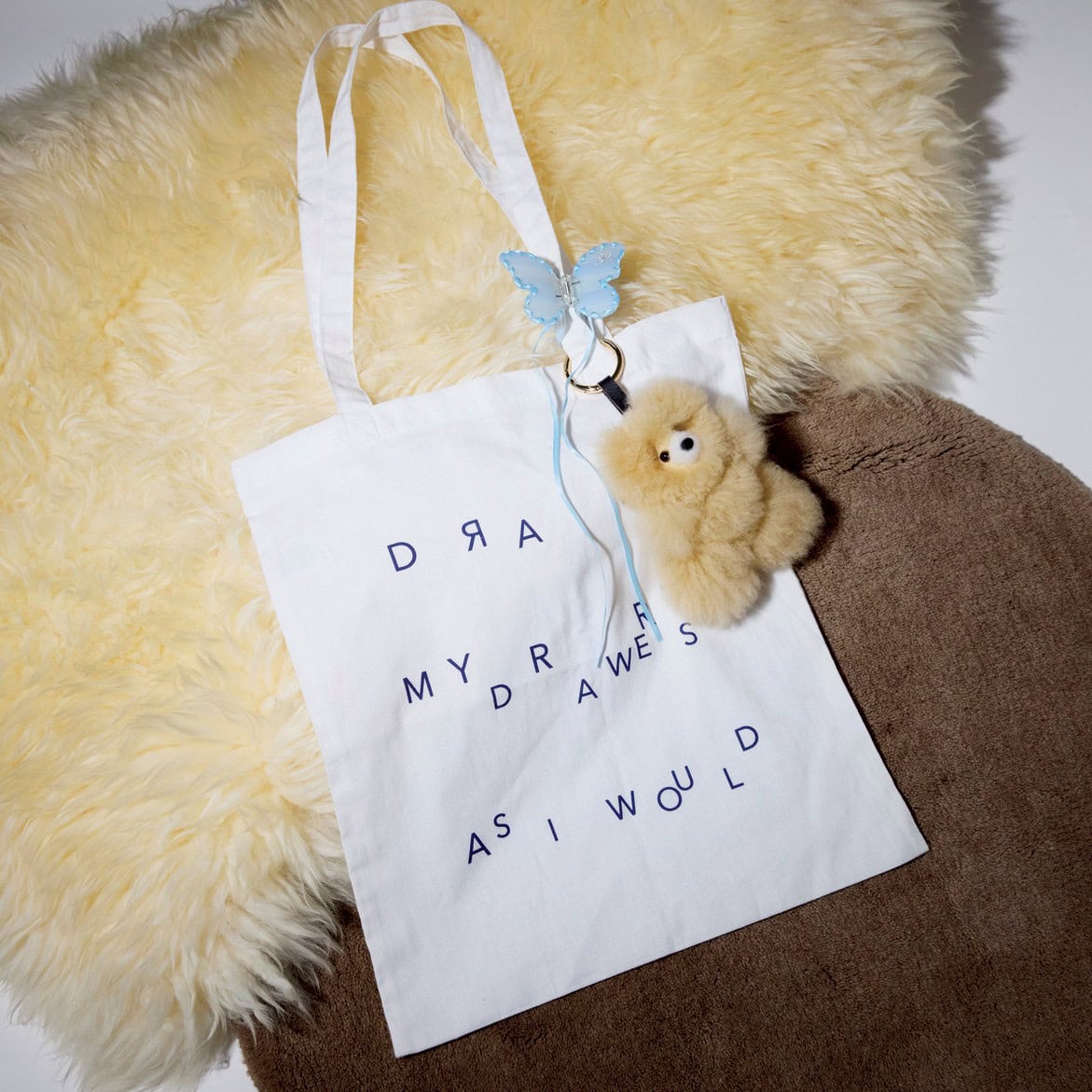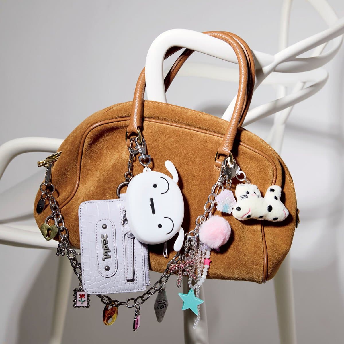 バッグ¥44,330/ミニットミュート(HANA SHOWROOM)、ロゴチャーム¥5,000/ア ベイシ ング エイプ®(BAPE STORE® 原宿)、ゴールドチャーム¥1,980/アネモネ(サンポークリエイト)、キャラチャーム¥3,500/sep