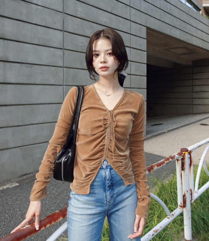 カーディガンはベロア素材と絶妙な透け感、立体感を生むギャザーなど他にないデザインがHIT。シンプルにコーディネイトしました。