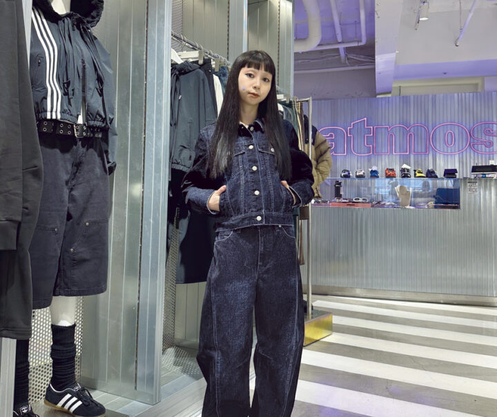 スニーカー¥18,700/adidas Orig inals×atmos pink、デニムジャケット¥16,500、デニムパンツ¥14,300/ともにアトモス ピンク(以上すべてアトモス ピンク フラッグシップ 原宿店)、チョーカー/本人私物