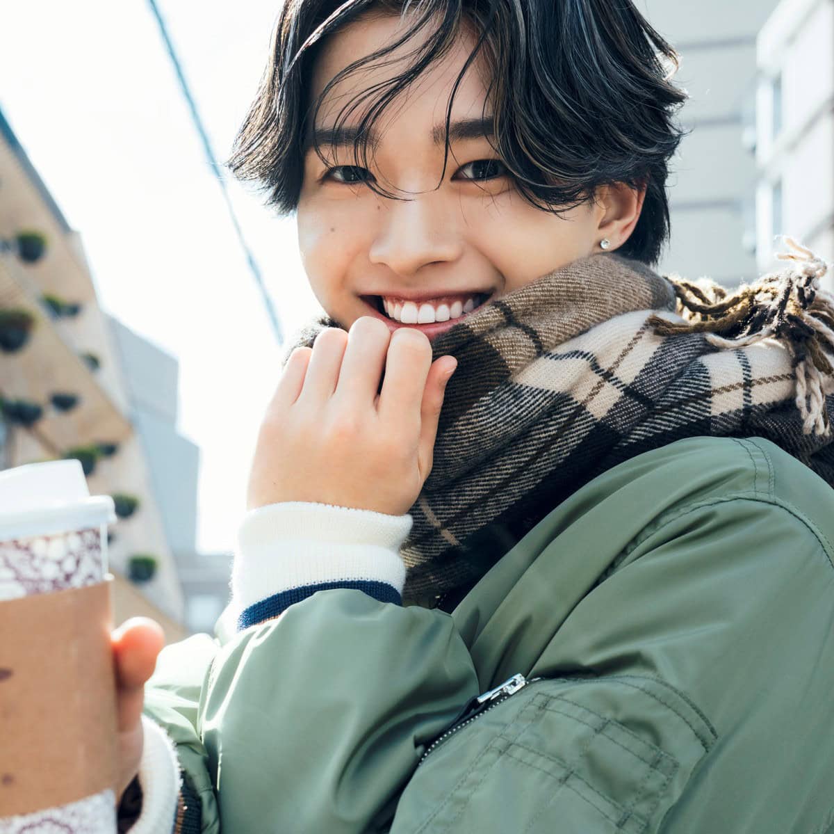 「スタジオセブンのジャケットは、ボリューム感と袖口がキュッとなってる感じが可愛くてお気に入り。全体的に緑や赤をさりげなく取り入れてクリスマスっぽさを意識しました。実は去年までハワイに住んでいたので、マフラーをするのは人生でほぼ初体験(笑)。日本の冬ファッションは、まだちょっと不思議な気分です」