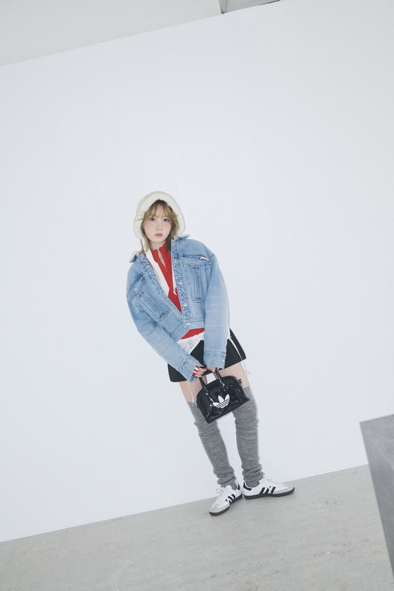 スニーカー¥15,950、ジップトップス¥14, 300、バッグ¥7,370/以上すべてアディダス オリジナルス(アディダス コールセンター)、Gジャン¥44,000/カルバン・クライン(カルバン・クライン カスタマーサービス)、スカート¥13,348/クランク(HANA SHOWROOM)、ヘッドアクセ¥12,100/メゾン バース(ジョワイユ)、ネックレス¥9,900/アウ(ハチマルゴショールーム)、ハイソックス¥2,200/靴下屋(タビオ)